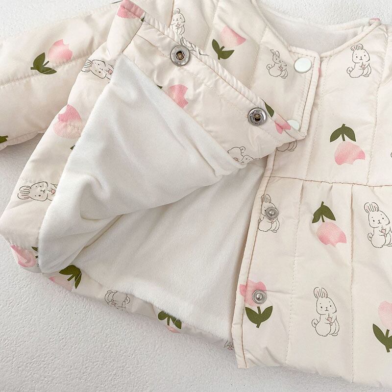 この可愛らしい花柄のジャケットは、韓国風のデザインで、ベビーとのお出かけにぴったりのアイテムです!66cmから100cmまで対応しており、成長に合わせて長くご利用いただけます。裏ボアと裏起毛の温かい素材で、寒い季節でも安心です。