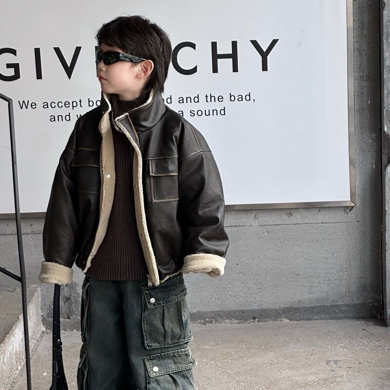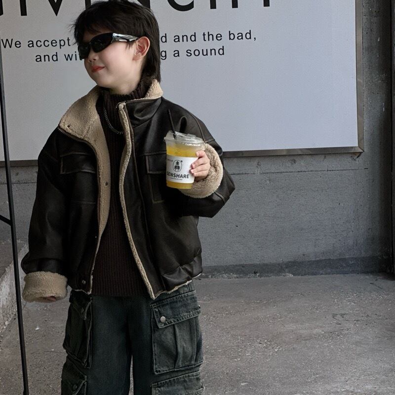 キッズ 子供服 トップス アウター ジャケット PU フェイクレザー 裏ボア★90-150CMのサイズ展開で、成長に合わせて長くお使いいただけます!おしゃれで暖かい裏ボアのデザインが、寒い季節のお出かけを楽しくしてくれるアイテムです。フェイクレザーのシンプルなスタイルは、どんなコーディネートにもぴったり!お子様のお気に入りの一着になること間違いなしです!