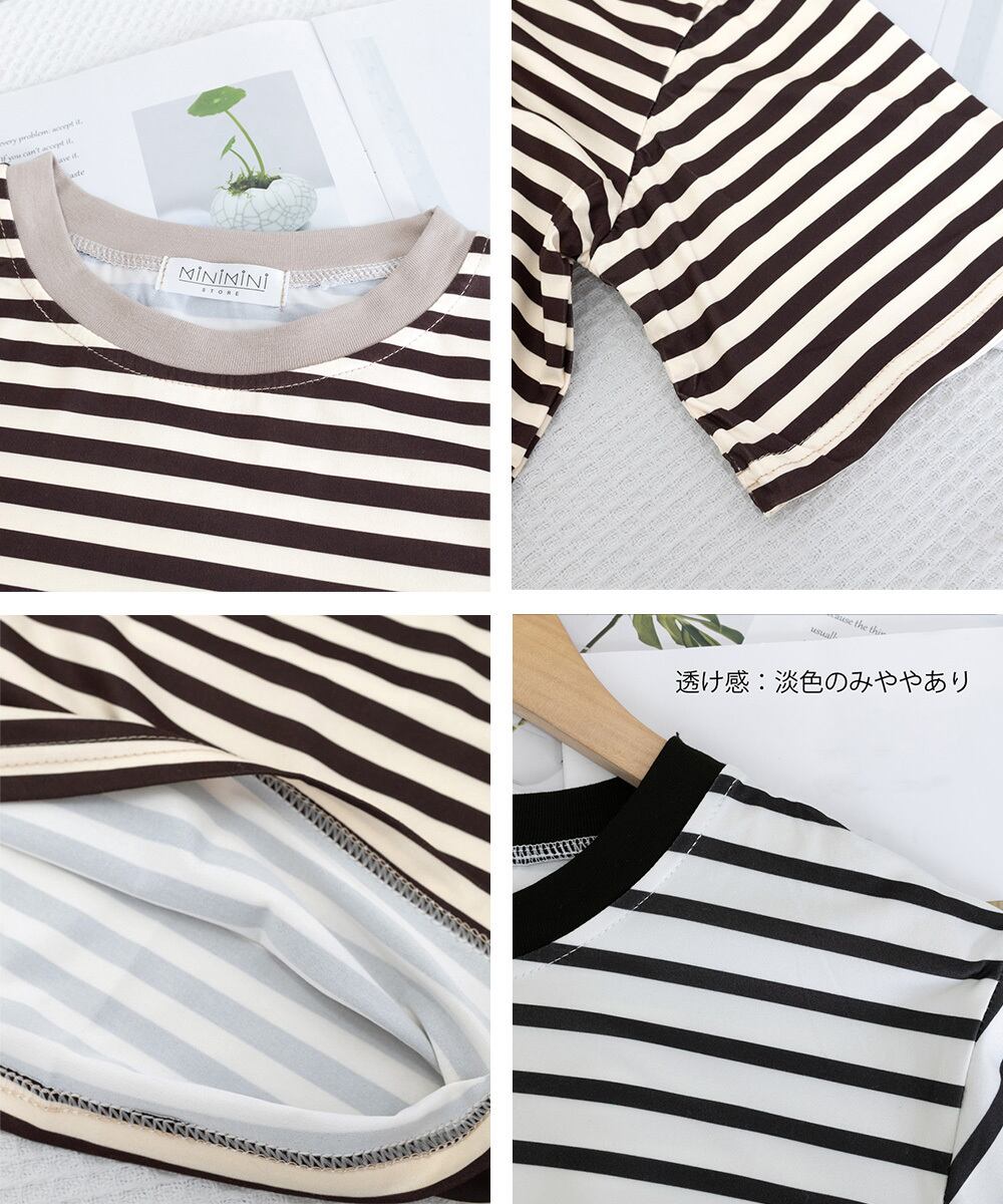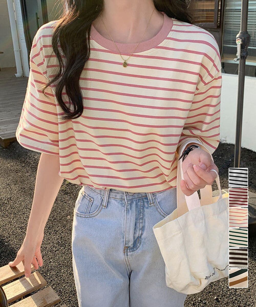 涼しいボーダートップス おしゃれ夏服 着やせ ラウンドネックTシャツ 配色プルオーバー 薄手カットソーカジュアルきれいめ