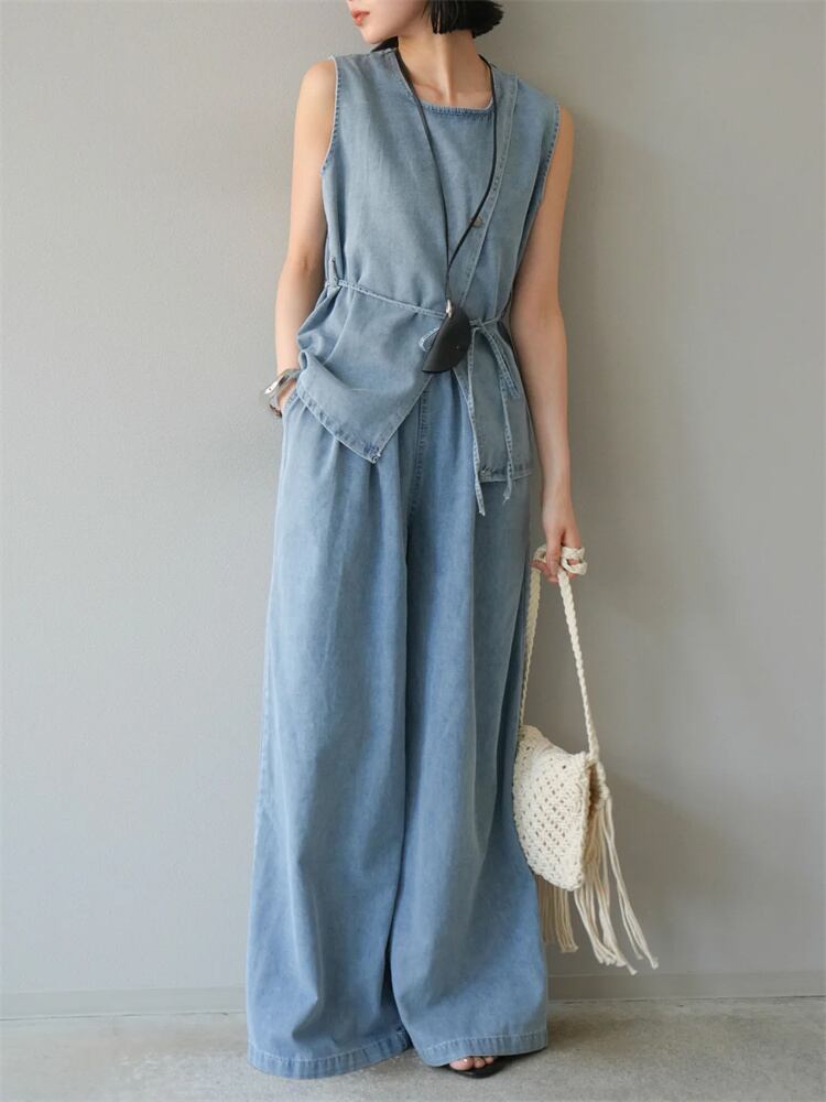 シンプルで洗練された印象のスリムデニムセットアップ。 ノースリーブトップスとデニムパンツがセットになっており、スタイリッシュなコーディネートが簡単に完成します。 軽やかな着心地で、デイリーから特別な日まで幅広く活躍。 柔らかい素材感は、肌に優しく動きやすさも抜群です。 スリムなシルエットが美しいラインを強調し、体型もすっきり見せてくれます。 デニムパンツは、スニーカーやサンダルと組み合わせてカジュアルに、ヒールをプラスして大人の女性らしさを演出にも最適です。 これ一着で、さまざまなシーンに応じたスタイルが楽しめ、あなたのファッションスタイルに新たな魅力を加えます。 オールシーズンおしゃれにお楽しみいただけるアイテムです。